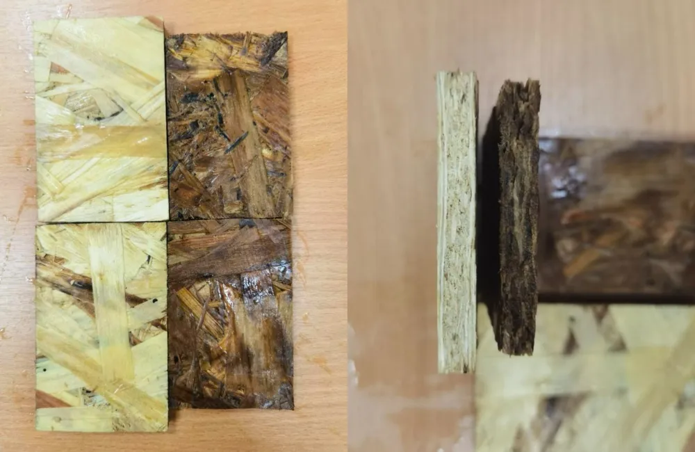 Сначала все шло без особых сюрпризов - муромская плита осталась без изменений, второй образец потемнел. Но самое интересное началось, когда обрезки начали сушить на батарее. Желтая плита просто высохла и вернулась к исходному состоянию. А темный образец начал распространять тяжелый казарменный дух - запах несвежей органики. Пришлось срочно прерывать эксперимент.
